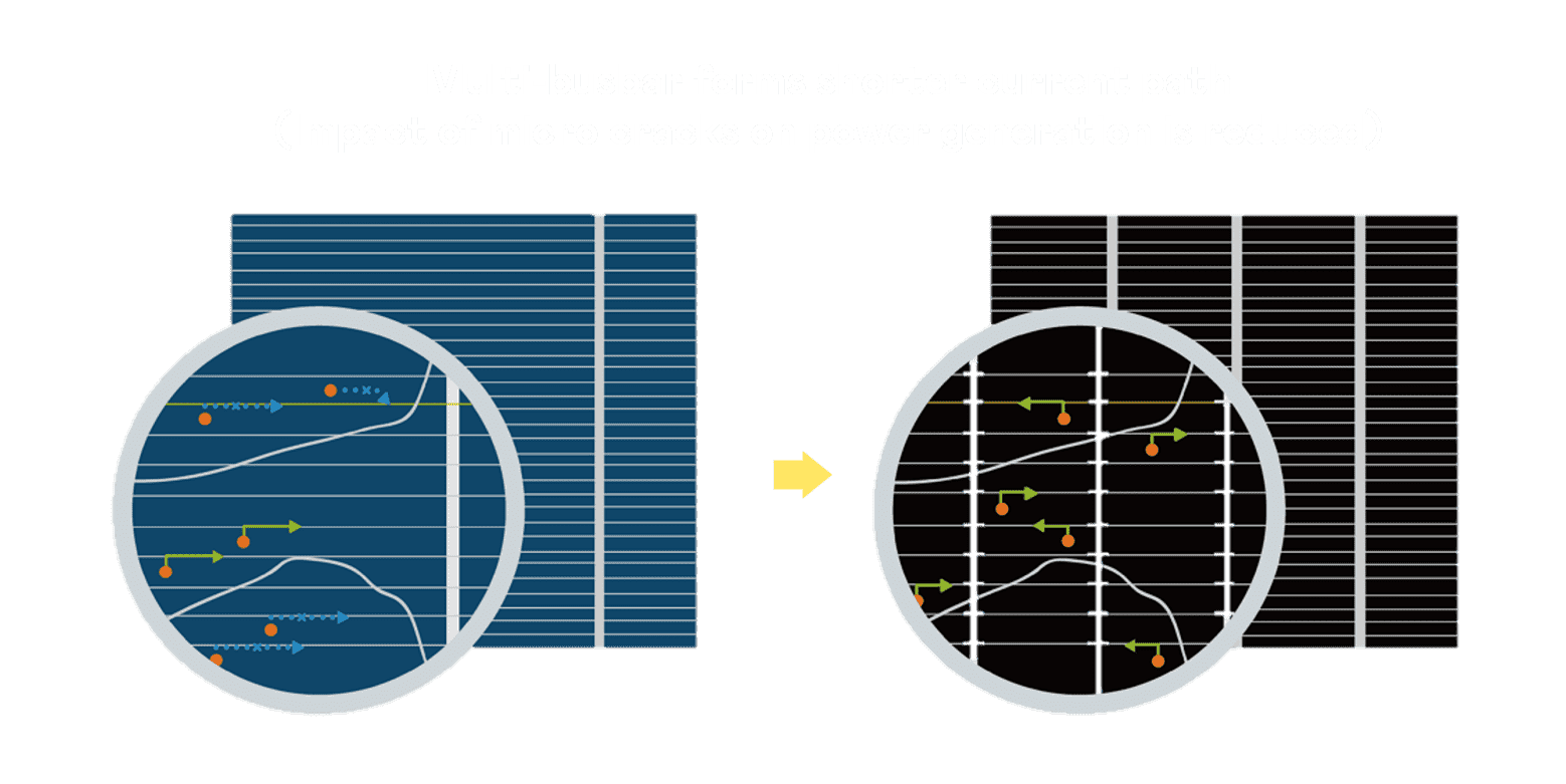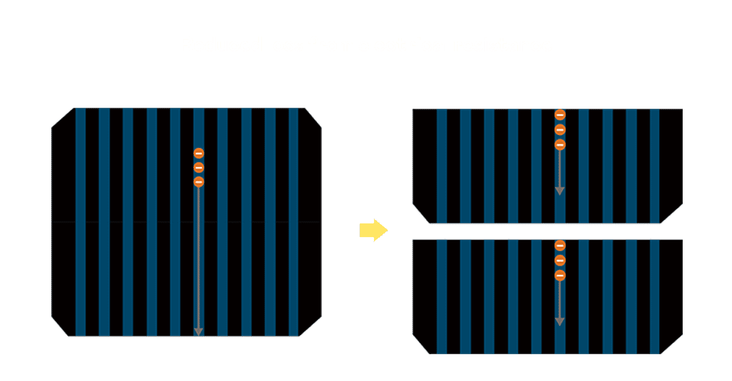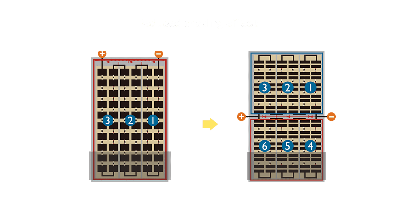 • 结合半切电池,,,,降低遮阴影响、、、提升模组抗隐裂能力、、、并减少电阻损耗,,,进一步提升模组发电效能。。。。